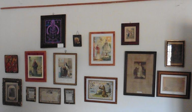 Colgados de la pared una serie de cuadros con láminas, pinturas y grabados de carácter religioso.